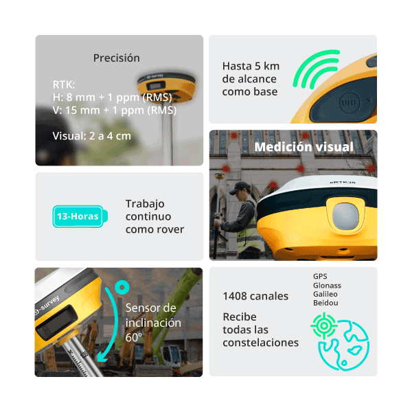 Inclinación de hasta 60°: Realiza levantamientos en terrenos inclinados o de difícil acceso sin necesidad de nivelar el bastón, mejorando la flexibilidad en el campo.